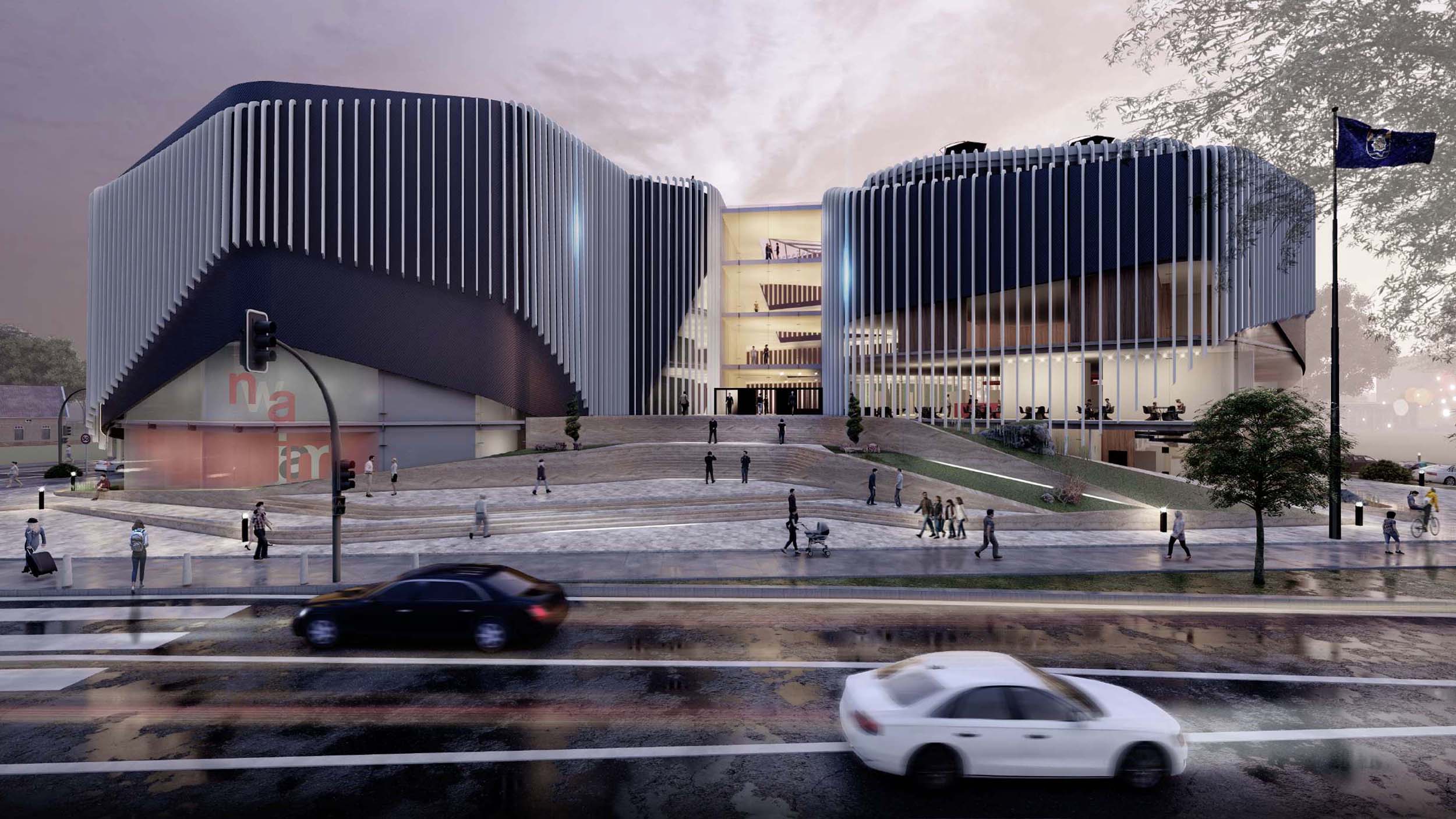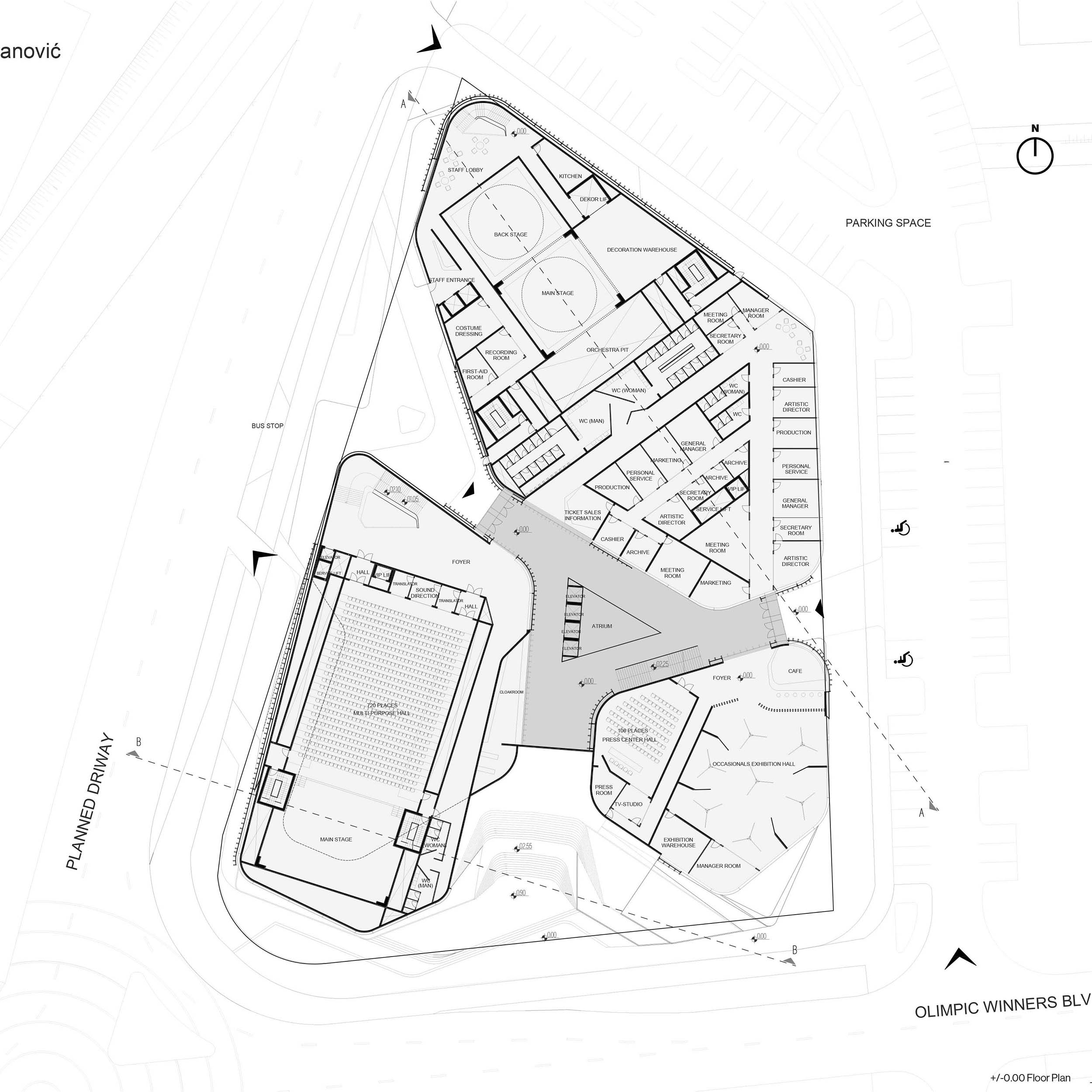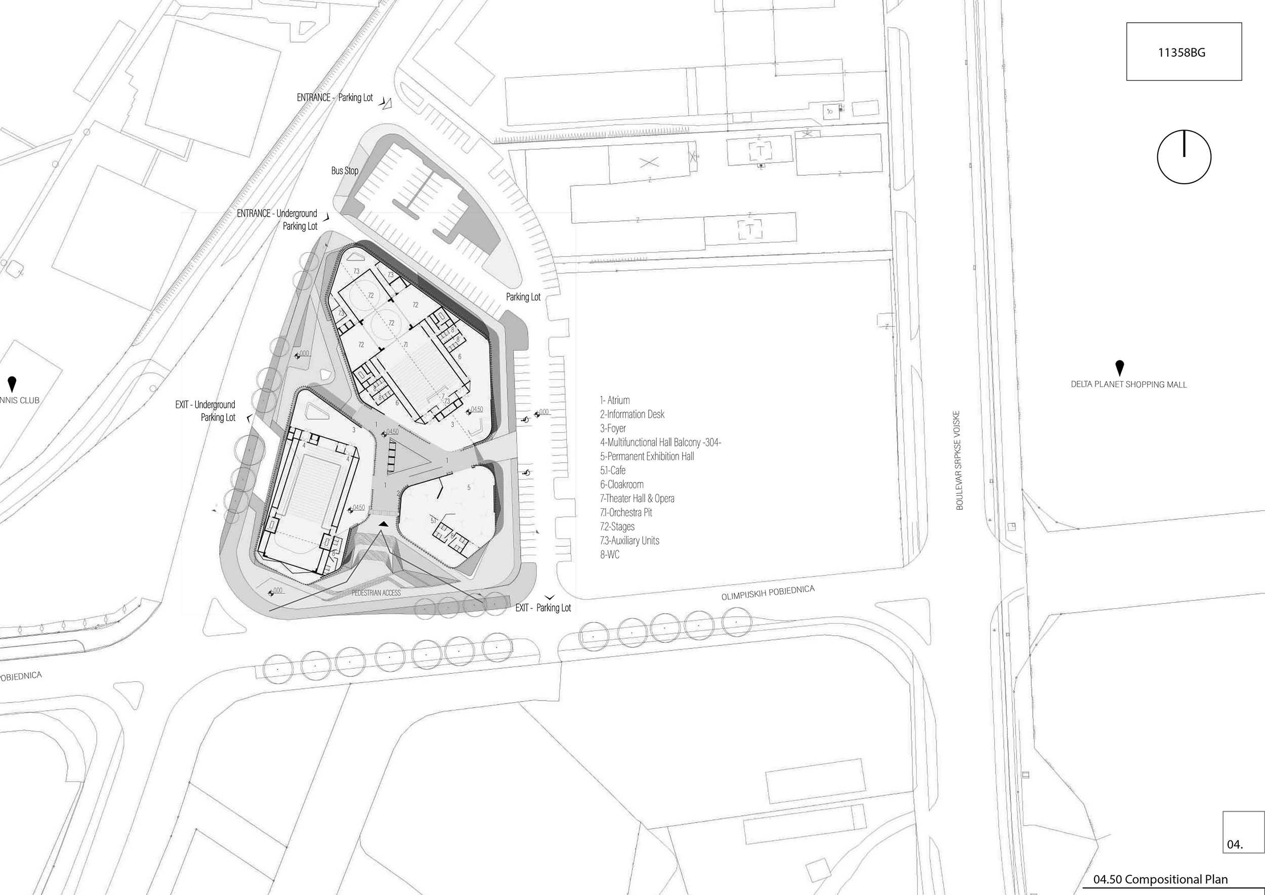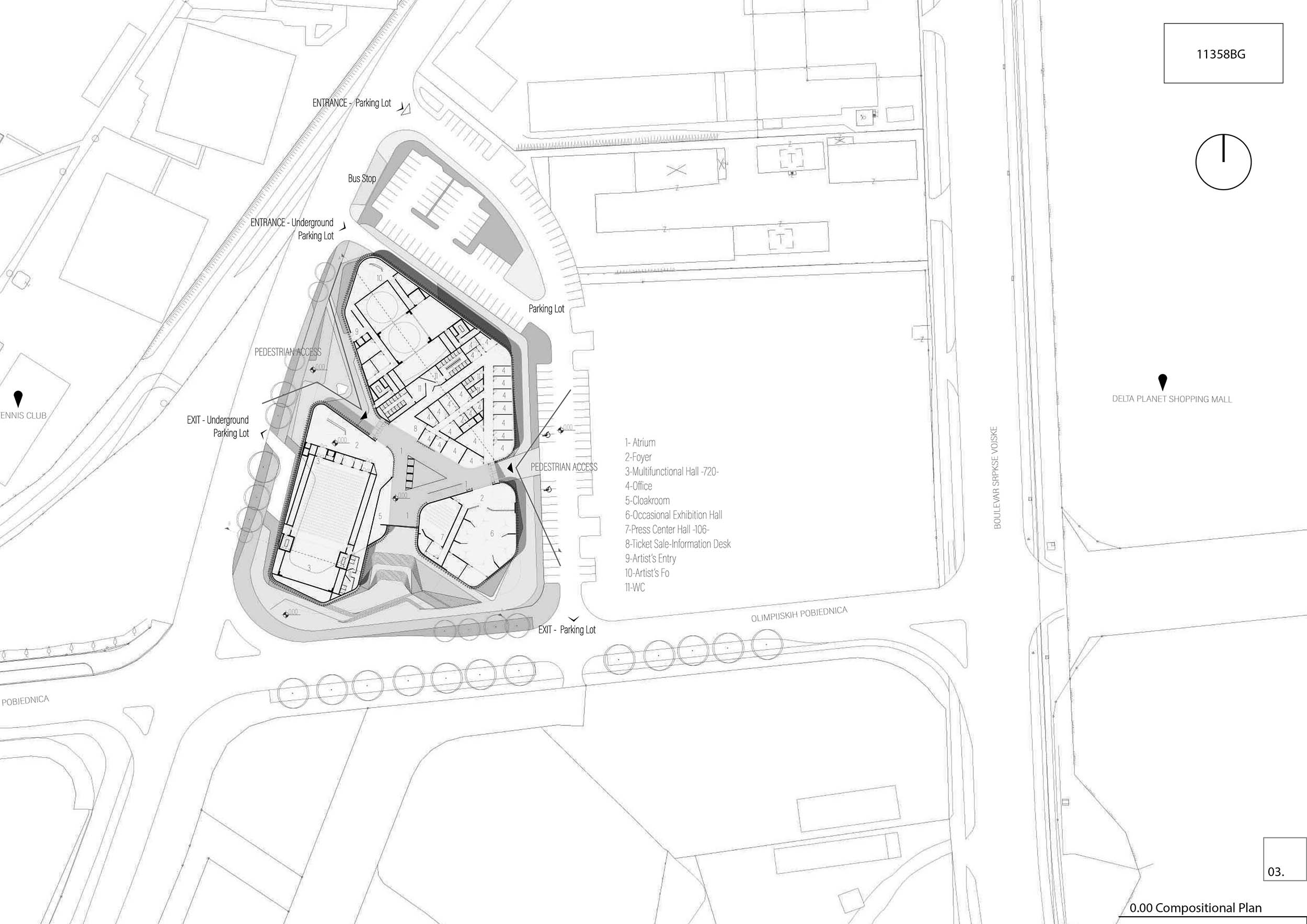 Ziyaretçi ulaşım aksları; Olimpijskih Pobjednika Caddesi’ne bakan güney girişi, Mladen Stojanovic Parkı’na açılan batı girişi ve açık otoparktan doğrudan erişim sağlayan doğu girişi olmak üzere üç ana noktada tanımlanmıştır. Bu kurguyla kompleks, şehrin farklı noktalarından erişilebilir hale gelmiştir. Güney cephesindeki merdivenler, yapının heykelsi etkisini pekiştirirken, şehir silüetine modern bir dinamizm kazandırmaktadır. Açık hava sahnesi olarak tasarlanan meydan ise, şehrin 24 saat yaşayan kamusal performans ve etkileşim alanı işlevini üstlenmektedir.
