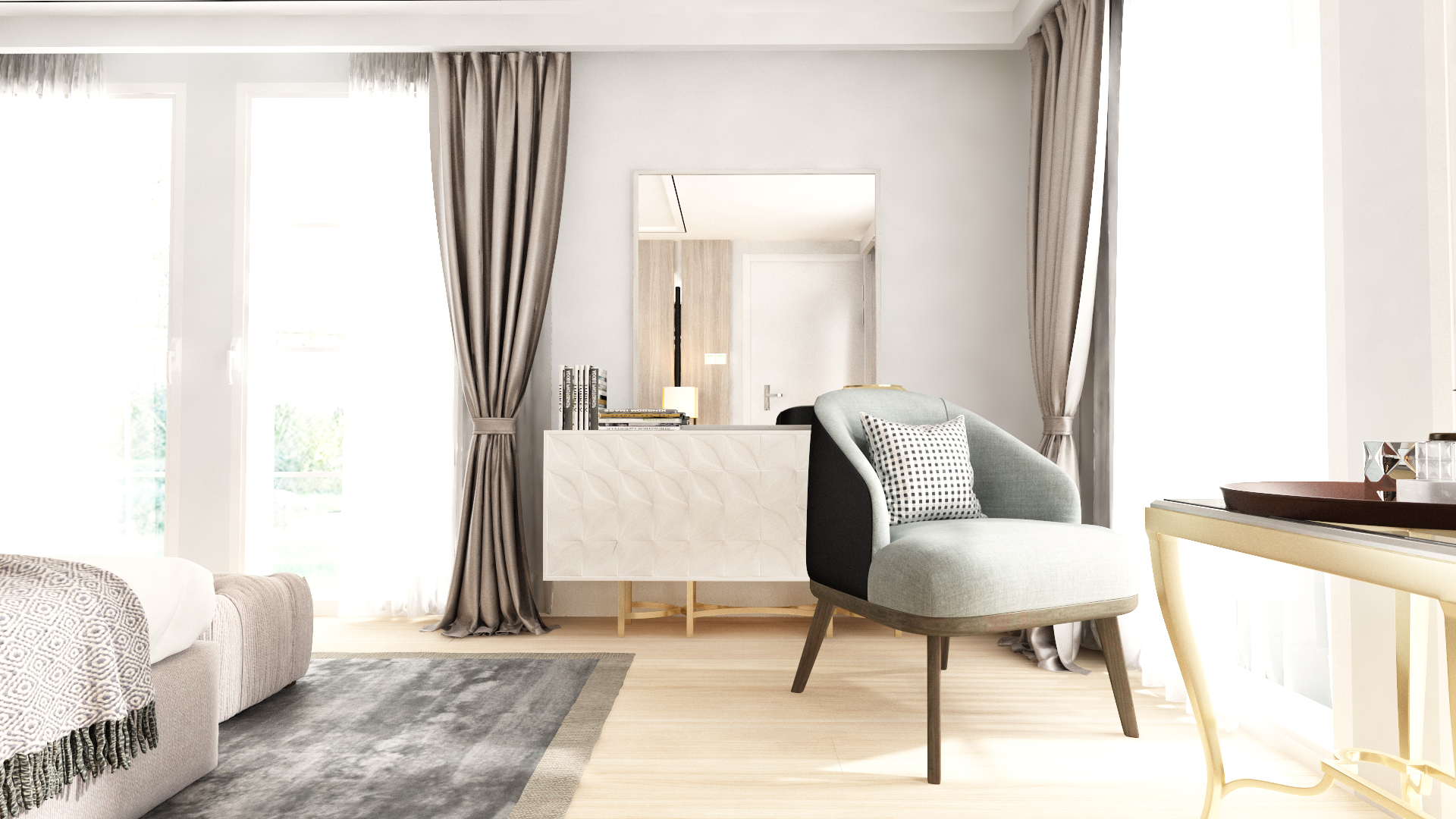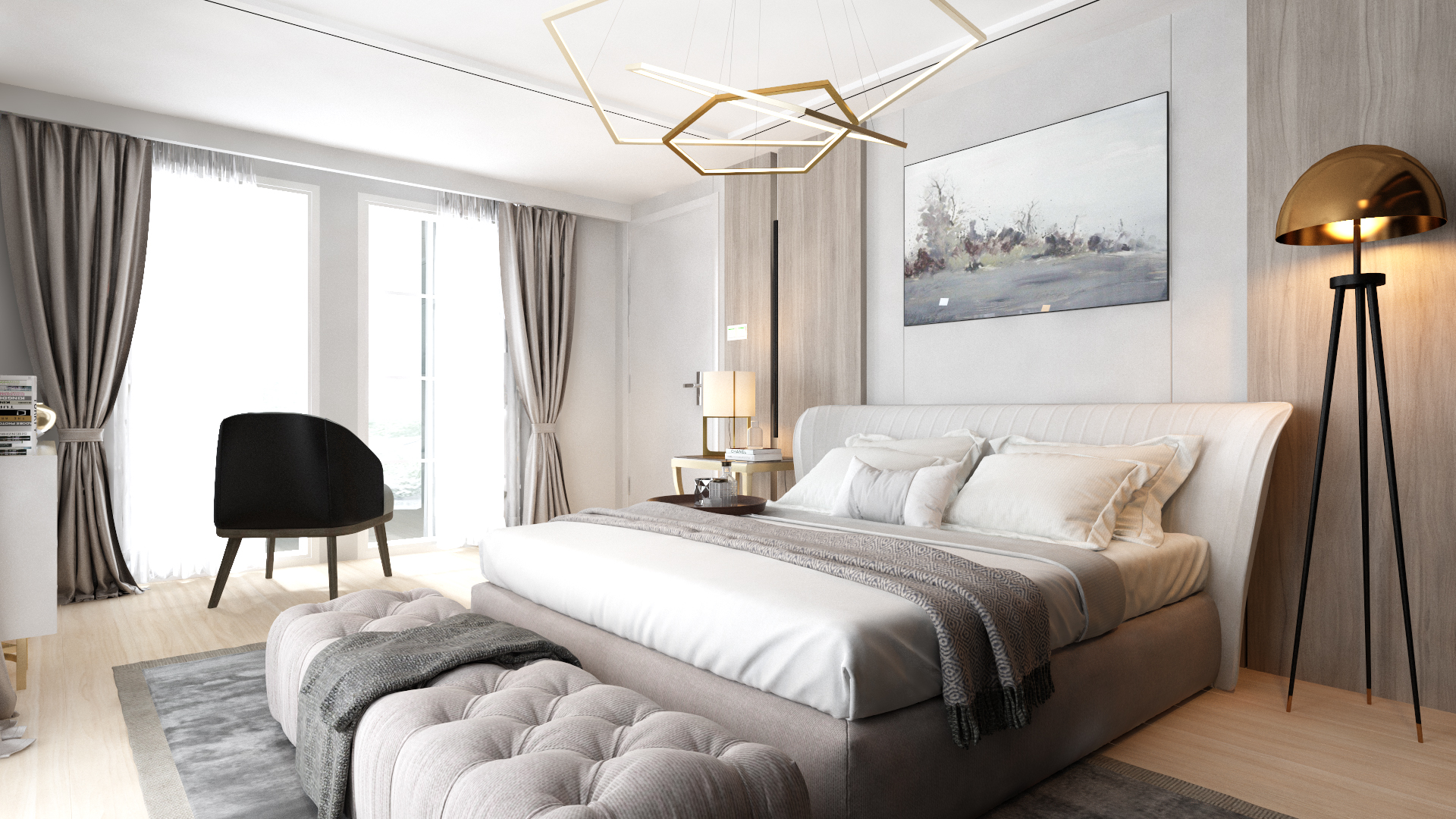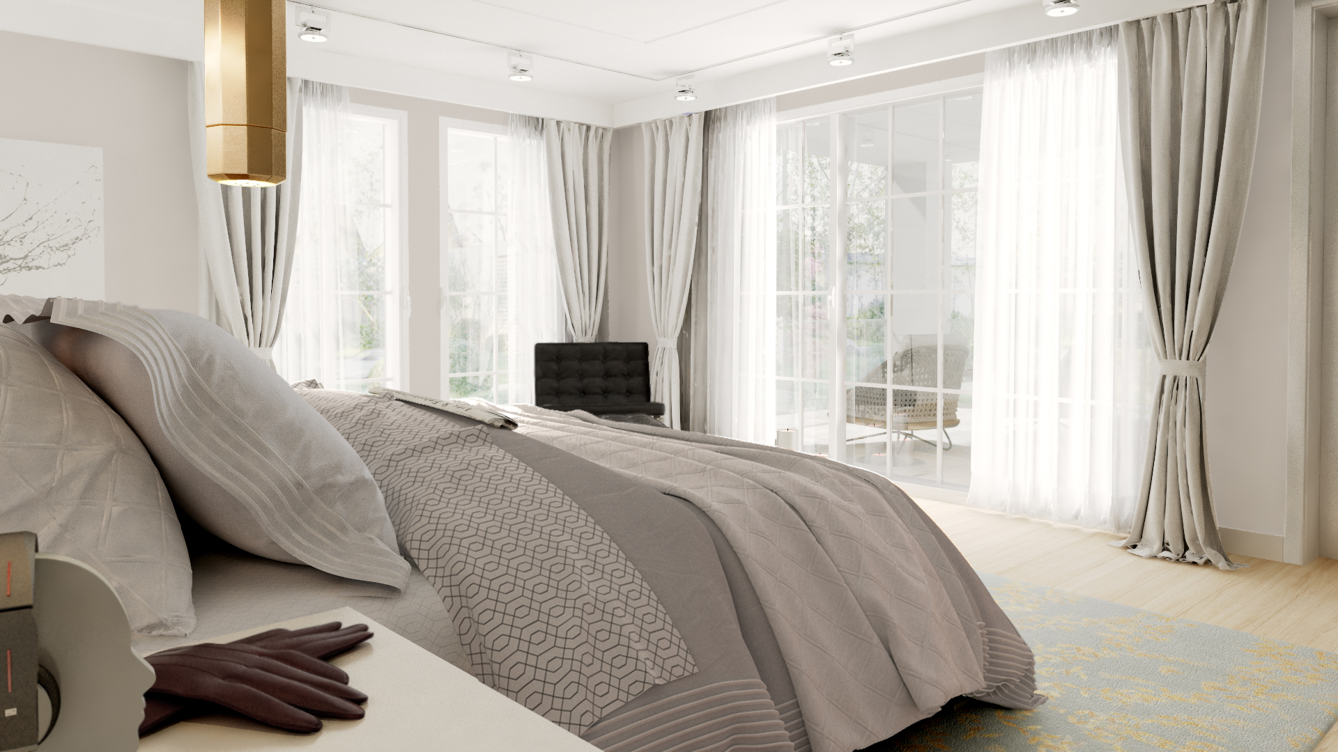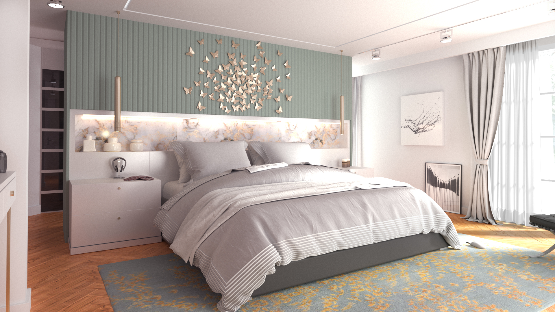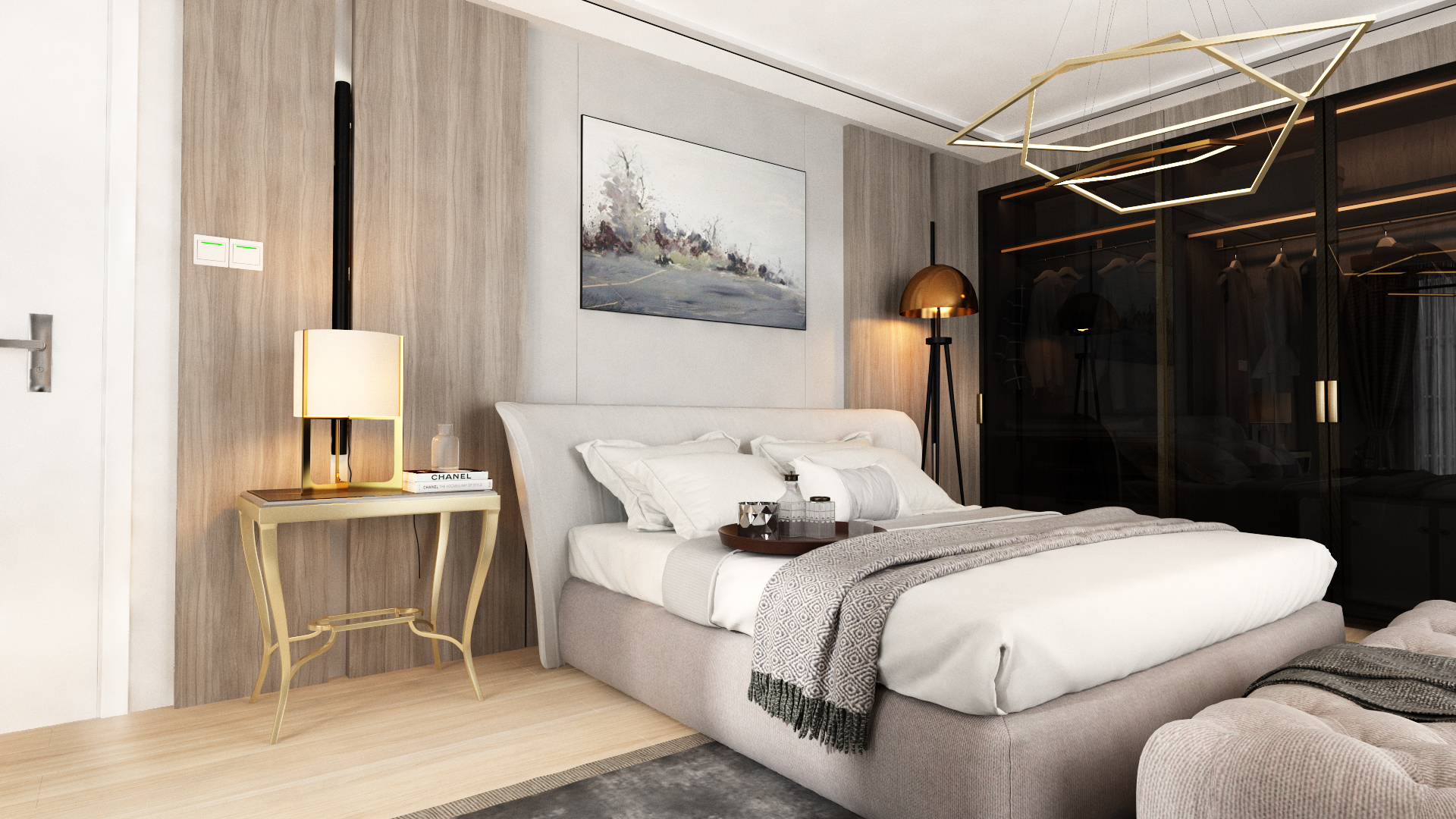 Üst katta, ana süit, duş ve giyinme odası içerecek şekilde yeniden tasarlandı. Giyinme odasının tasarımdaki ele alınış biçimiyle oluşturulan duvar, yatak için zarif bir arka plan oluştururken, aynı zamanda yatağın manzara yönüne doğru stratejik bir yönlendirme unsuru görevi üstlendi. Bu akıllı çözüm, mekanın hem işlevselliğini hem de estetiğini artırdı. Oluşturulan renk paletleri, mobilya seçimi ve yerleşimleri, modern bir stili yansıtırken, kullanıcıların kişisel zevklerini ve yaşam tarzlarını da yansıtan donatılar olmasına özen gösterildi. Bu titiz yaklaşım sayesinde, mekanın bütünü minimalist tarzıyla zamansız ve zahmetsiz bir zarafet sunuyor.